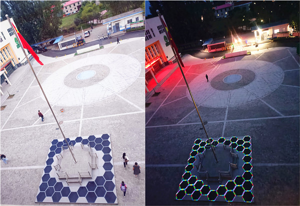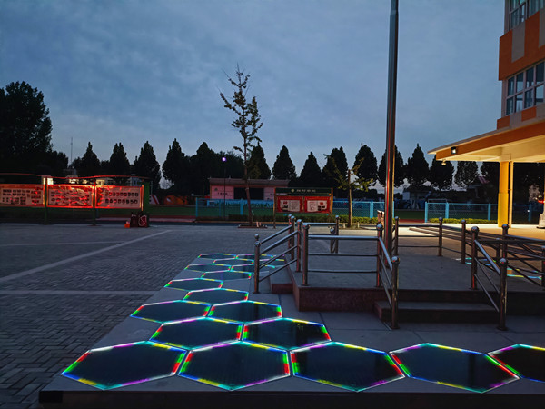 為了讓校園的廣場地面有更多實用性功能,在不影響行人的基礎上,采用光能寶盒發電系統,白天直接代替地板磚進行發電,所發的電儲能留到晚上為科技樓與教學樓間的風雨走廊提供照明用電,夜間還能發出五顏六色的景觀亮化光線,豐富校園景觀氛圍。