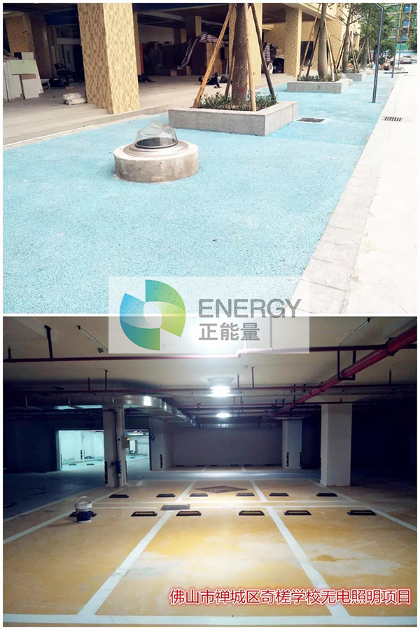 為展現學校的生態化、智能化、國際化。選用了“零污染、零排放”的佛山正能量光導照明系統。該系統所用材質均為環保可回收材質;安裝于室外的采光罩采用德國拜耳優質PC材質制成,抗沖擊、抗老化、抗污(因添加了納米抗污技術,具有自動清潔功能)。在收集自然光的時候能將90%的有害紫外線及熱量過濾掉,在通過導光管傳送至漫射器。漫射器將光打散后傳送至室內各個角落。使用全程無需市電,不受停電及天氣的影響。在天氣不佳時自帶的補光系統將及時補光,達到最佳照明。2-3年收回成本。質量保用25年。